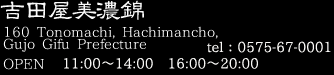 | AyuZukushi | Fresh Nagara River ayu four-course set menu - ayu sashimi, shioyakiayu, ayu rice broth and gyoden (miso grilled ayu), served with steamed rice. (July - August only.) |